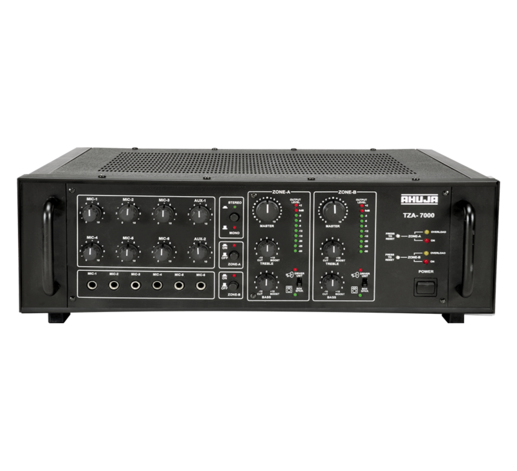 Ahuja model TZA-7000 is rugged, reliable, cost-effective 700 watts Two Zone Amplifier. TZA-7000 is ideal for multi-speaker installations where a user needs to separately set power levels for two separate areas such as indoors & outdoors.