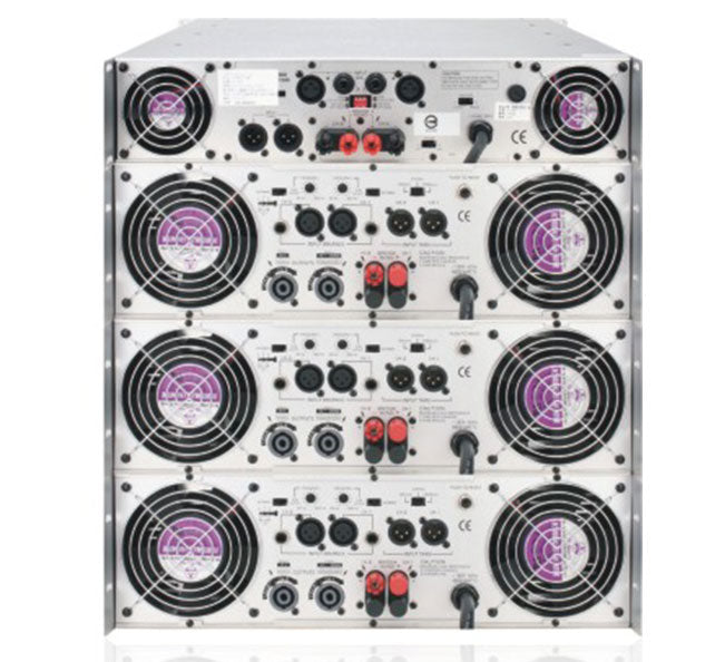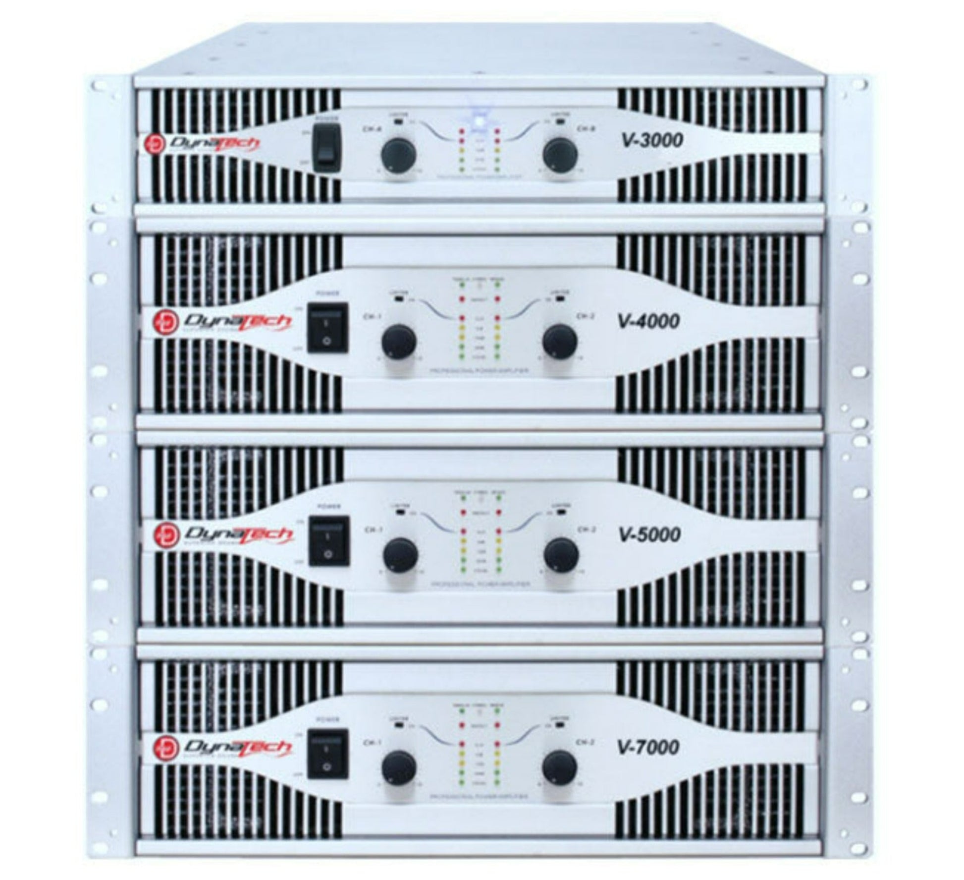 Dynatech V Series Power Amplifiers deliver from 500 Watts to 6800 Watts of power in two to three rack spaces. High current transistors combined with low noise input amplifiers enable the V series to deliver exceptional power.