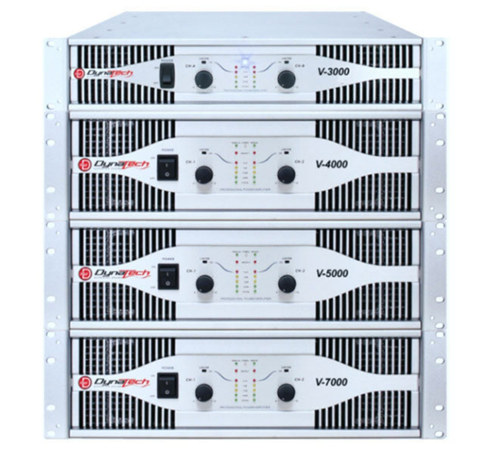 Dynatech V Series Power Amplifiers deliver from 500 Watts to 6800 Watts of power in two to three rack spaces. High current transistors combined with low noise input amplifiers enable the V series to deliver exceptional power.