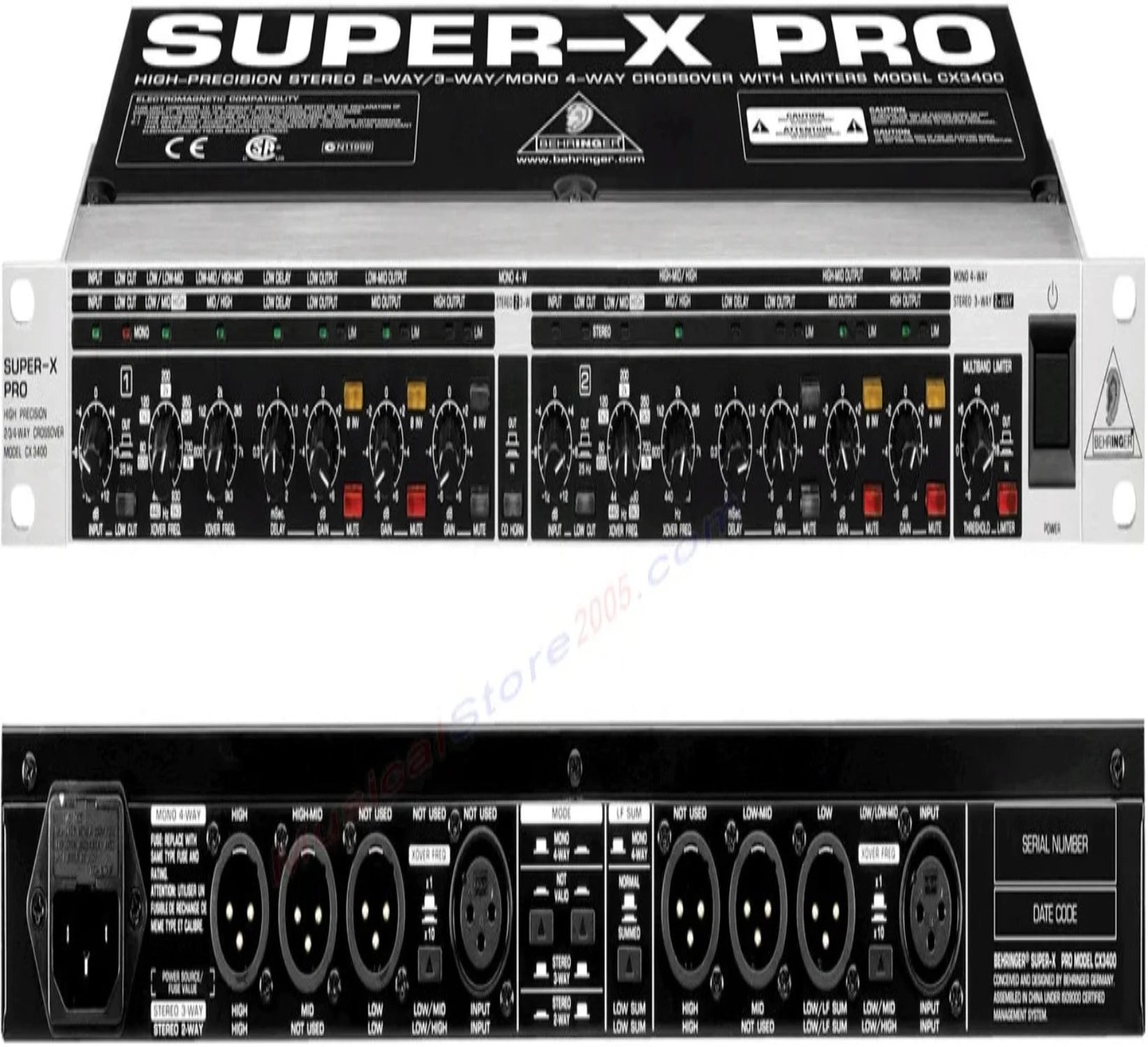 The Behringer Super-X Pro CX3400 is a fully versatile crossover that's perfect for any professional live sound rig. The CX3400 is capable of either 2-way or 3-way stereo, or 4-way mono operation. Equipped with 24dB/octave Linkwitz-Riley filters, the CX3400 gives you the steep crossover bands you demand. Each output features an independent level control and phase inversion switch. For use with a subwoofer, the CX3400 also includes a low-frequency output summing option. For the flexibility you need in configuring your PA system, check out the Behringer Super-X Pro CX3400.