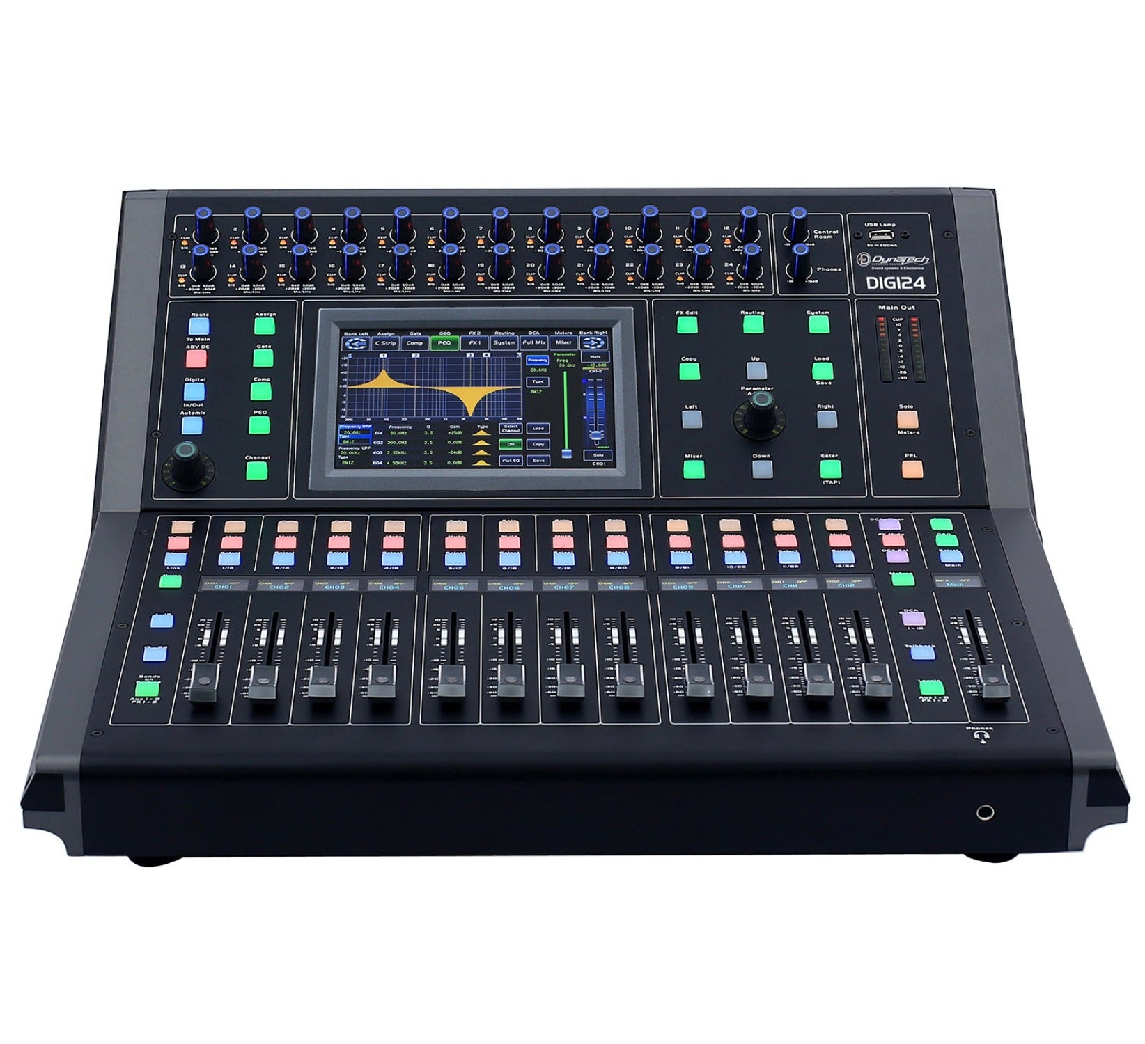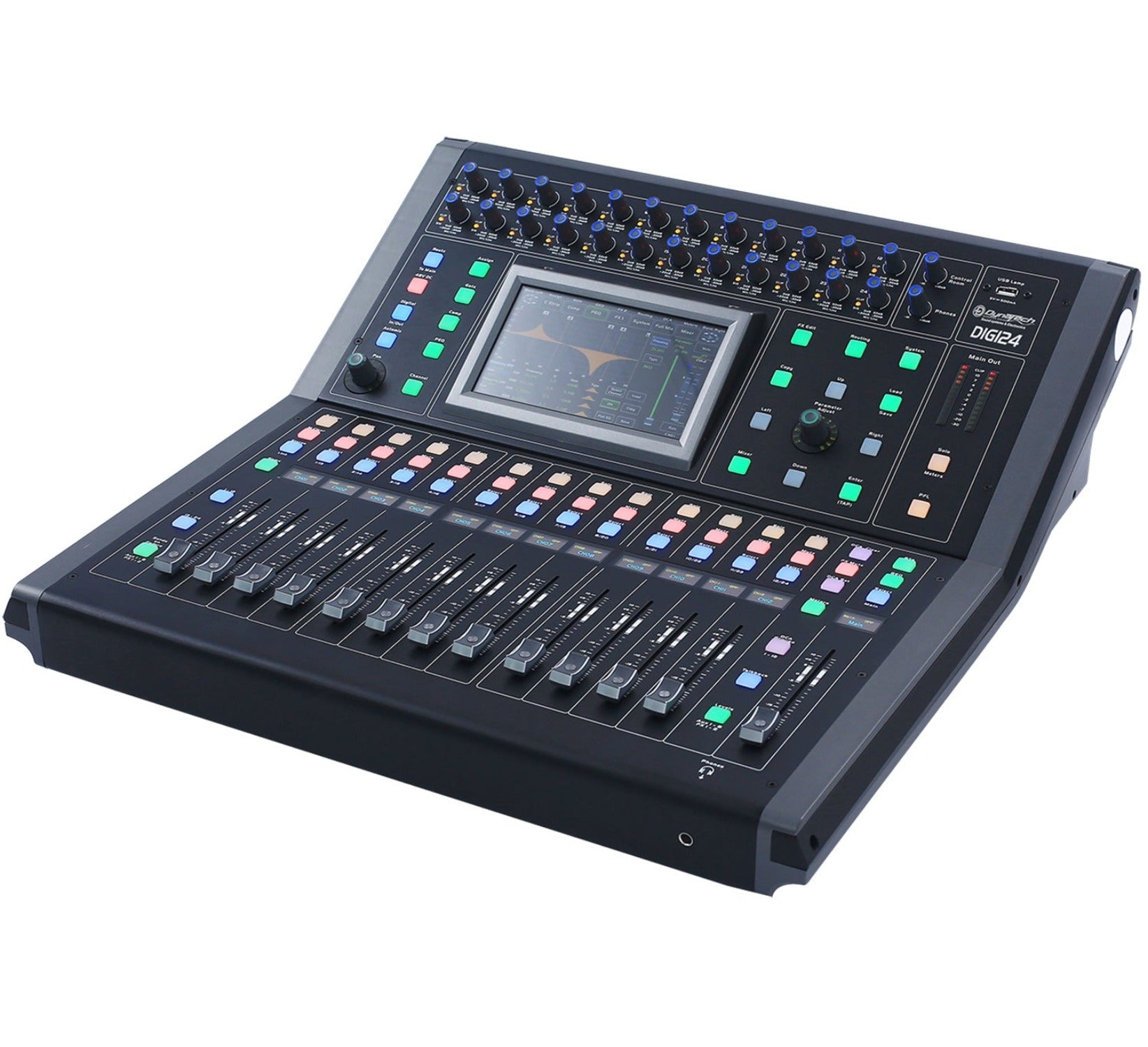 The Digi24 is a 24 channel digital mixer for live applications and fixed installations with very powerful signal processing. The 8 AUX bus architecture offers flexibility for monitoring or effects send and it is equipped with large motorized faders showing instantly the level of signal or parameters to be edited.