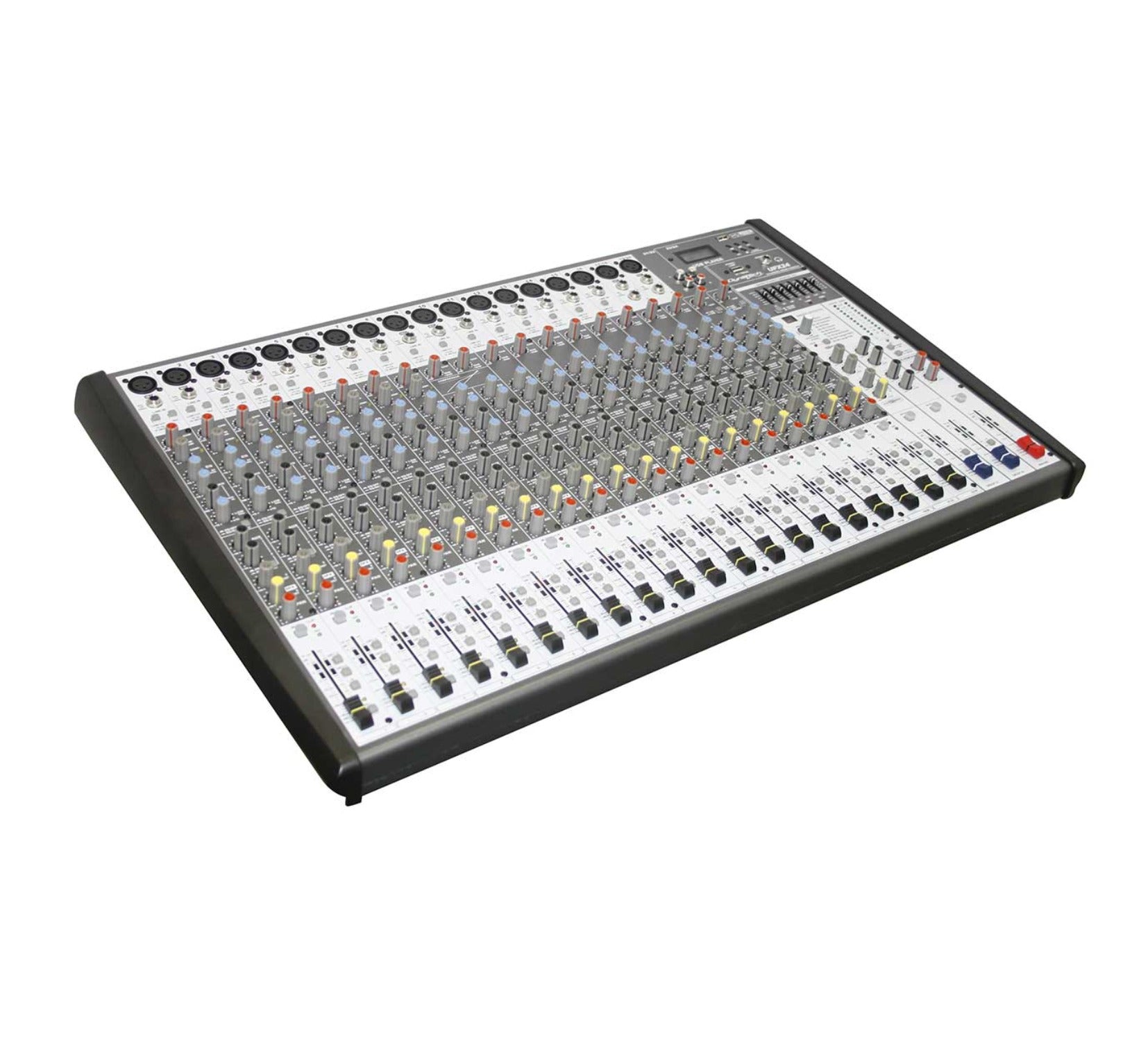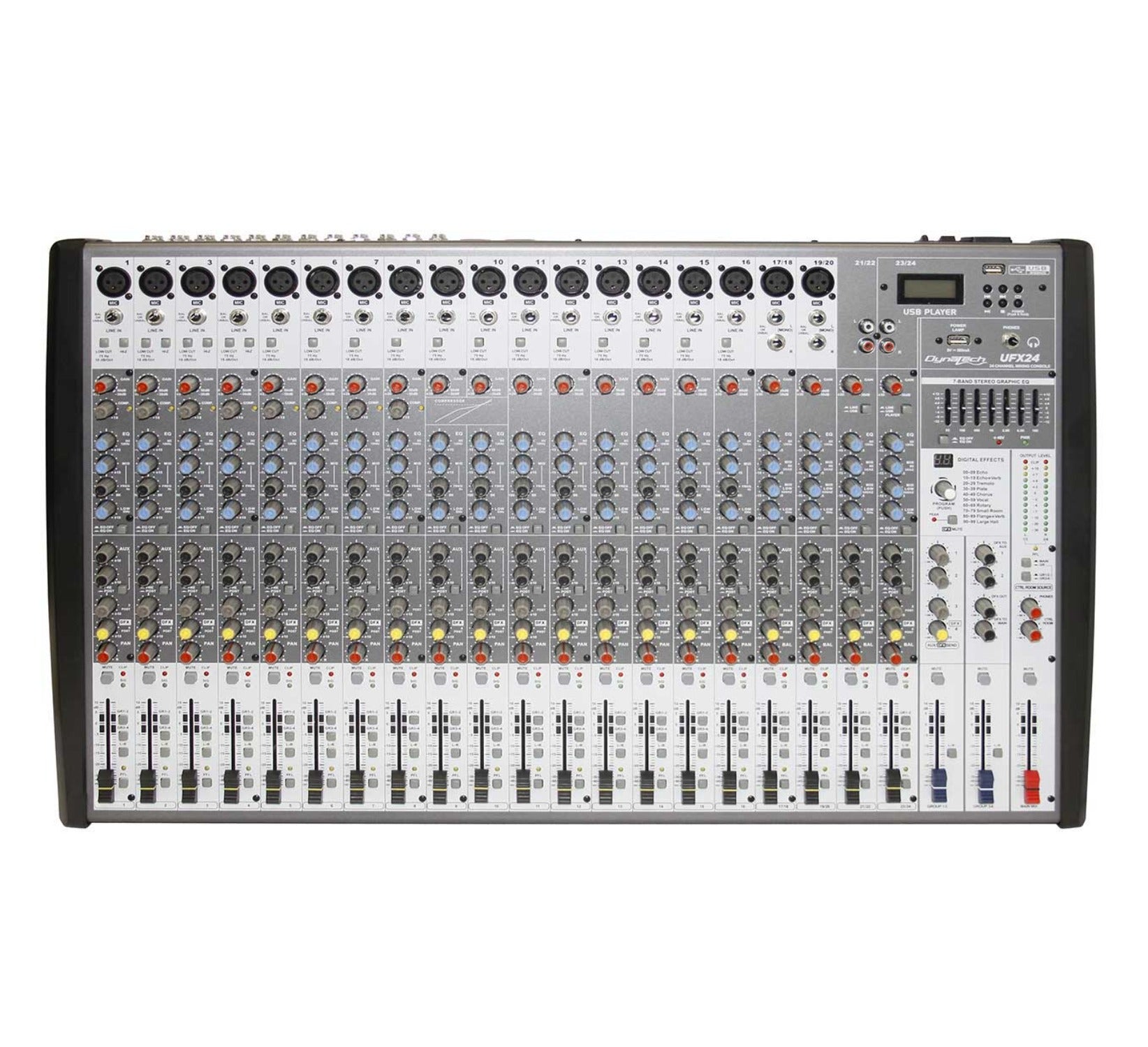 UFX24 is a professional compact mixer to give you great quality and better reliability than ever before. You will get smooth, accurate more natural and open sound from this apparatus. It is ideal for gigs, recording and fixed PA installations. The UFX12 Mixing Console is packed with features that cannot be found in other consoles of its size: 8/16 mono (provided with ultra low noise microphone pre amplifiers and Phantom Power at +48 Volt ) and 4 stereo input channels, 3-band EQ with sweepable MID on mono inputs;4-band EQ on stereo inputs, 4 auxiliary control, highly accurate 12-segment bar graph meters and 2-track inputs assignable to main mix, control room/phone output.