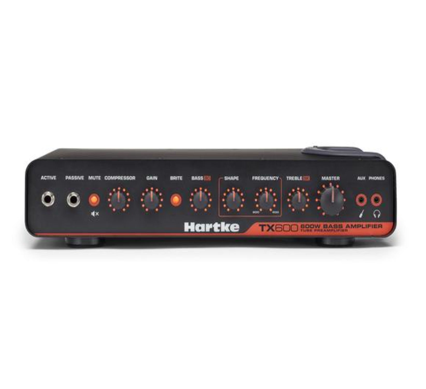 The TX600 hybrid electric bass amplifier head is Hartke's most portable design. Despite only weighing seven pounds, this compact amp head boasts a Class D power amplifier that pushes out an impressive 600 watts. The TX600 front-panel's features and EQ controls will be familiar to fans of Hartke's designs, and the straightforward nature helps you dial your tone in quickly and easily. You'll also find features such as a compressor, an effects loop, and a Brite switch to further sculpt your ideal bass tone with the TX600.