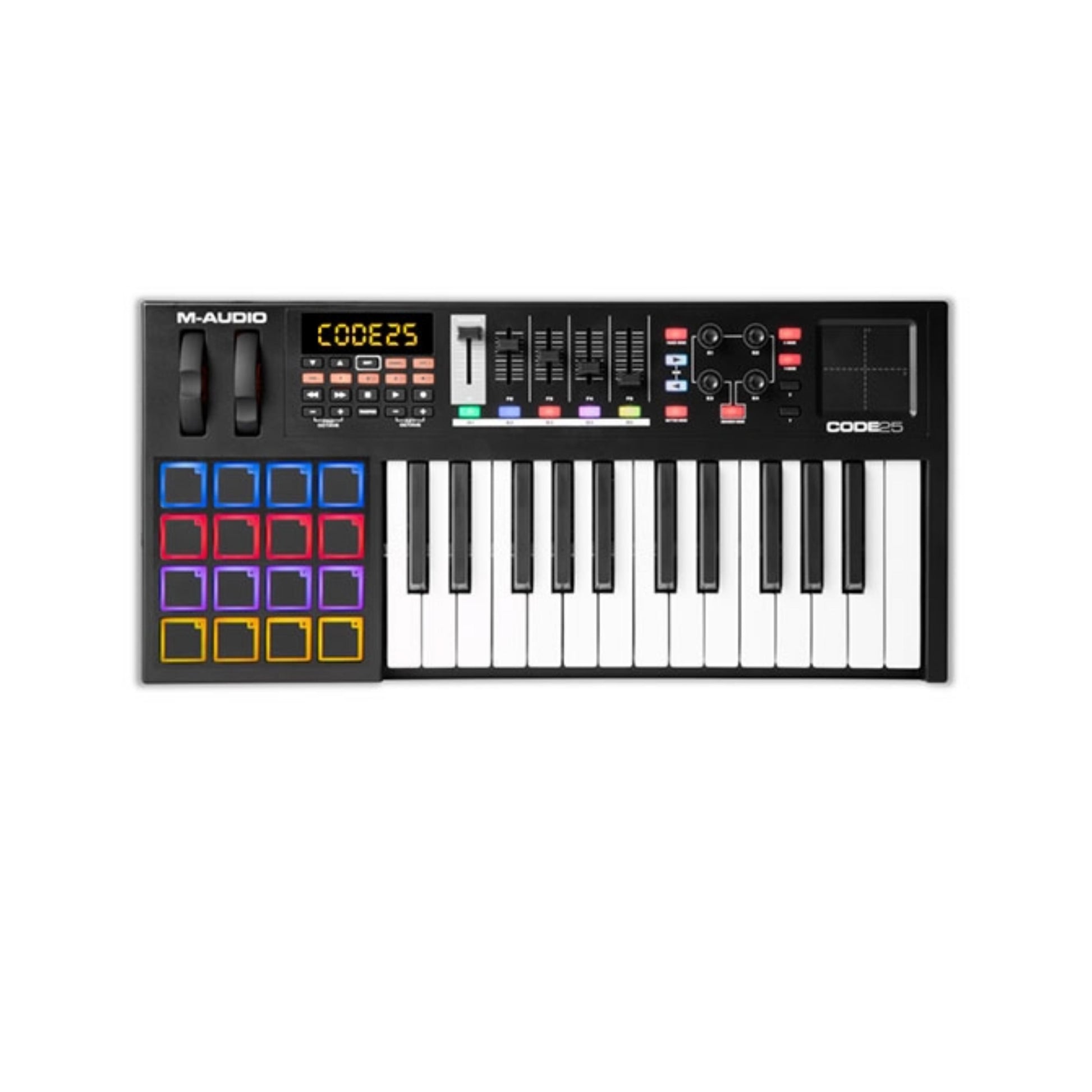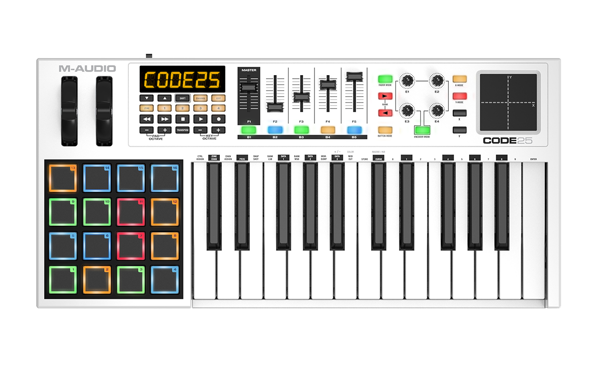 Take full command of your DAW with the M-Audio Code 25 MIDI keyboard controller. The Code 25 rocks a buttery 25-note semi-weighted keybed with aftertouch, 16 assignable backlit drum pads, an XY pad, five faders, and four rotaries. There's also a six-digit LED display, so you're never in dark, status-wise. Of course, there's a sustain pedal input, but you also get an expression pedal input, so you can filter sweep those massive two-handed chords. Factor in the bundled software and striking Mondrian-esque visuals that'll look great onstage, and you've got a winning package.