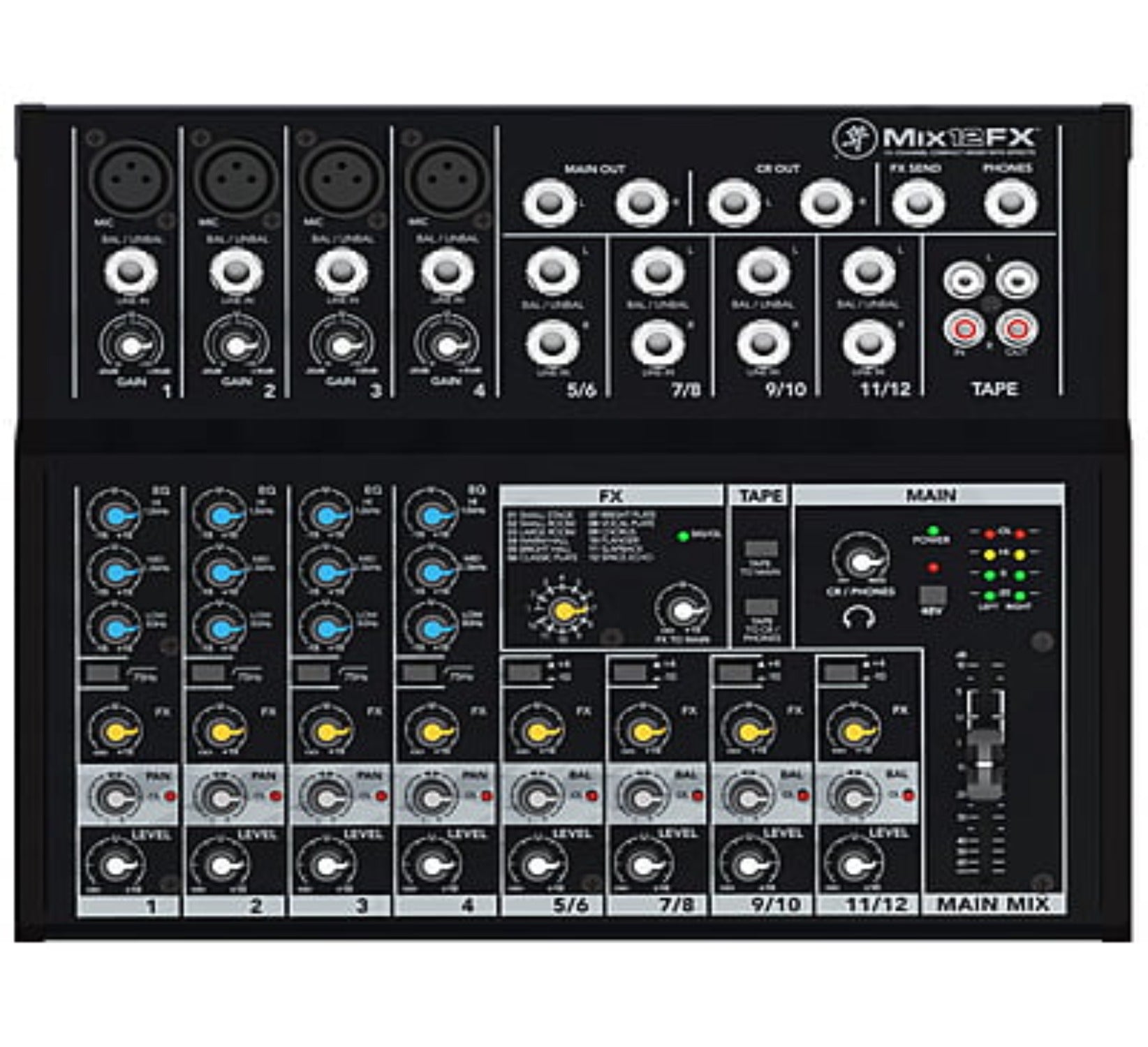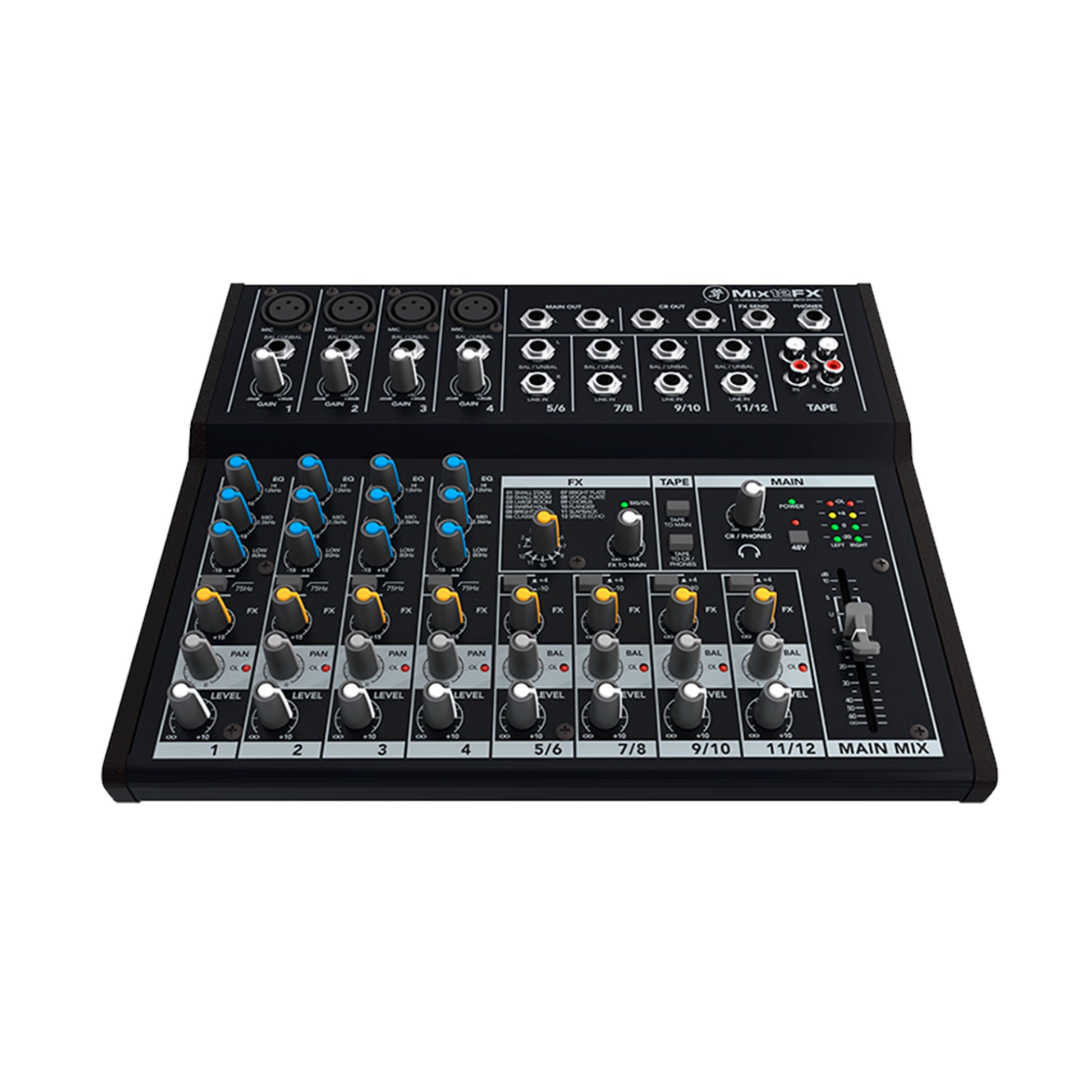 The midsize Mackie Mix12FX desktop audio mixer offers you the full-scale functions and the quality everyone here at Sweetwater has come to expect from Mackie. Four microphone preamplifiers with switchable phantom power, 3-band EQs, and 75Hz highpass filters accommodate a wide range of mics and mixing conditions. Another four stereo channels let you connect keyboards, media players, and other line-level gear. Each channel also comes with an FX send, which lets you tap into Mix12FX's effects processor. Twelve onboard digital effects make it easy to add reverb to vocals, depth to drums, or atmosphere across your mix.
