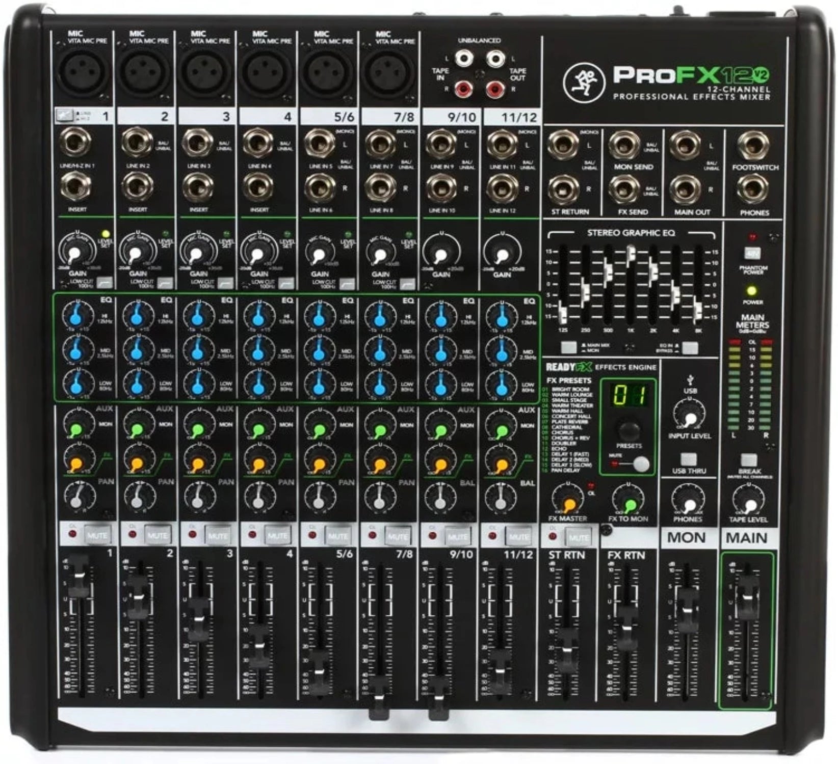 The Mackie ProFX12v2 12-channel USB mixer means you can stop sacrificing sound quality for portability at your smaller band and solo acoustic gigs. At Sweetwater we believe every gig you play can sound great, and the ProFX12v2 packs that great sound along with the features of a large format mixer into a size that makes sense. You get six of Mackie's Vita preamps for your mic, guitar, keyboard, or anything else you need for your show. After you've plugged in, tap into the powerful ReadyFX effects engine to add excitement to your mix. Show your audience you care by giving them the best sound you can with the Mackie ProFX12v2 USB mixer.