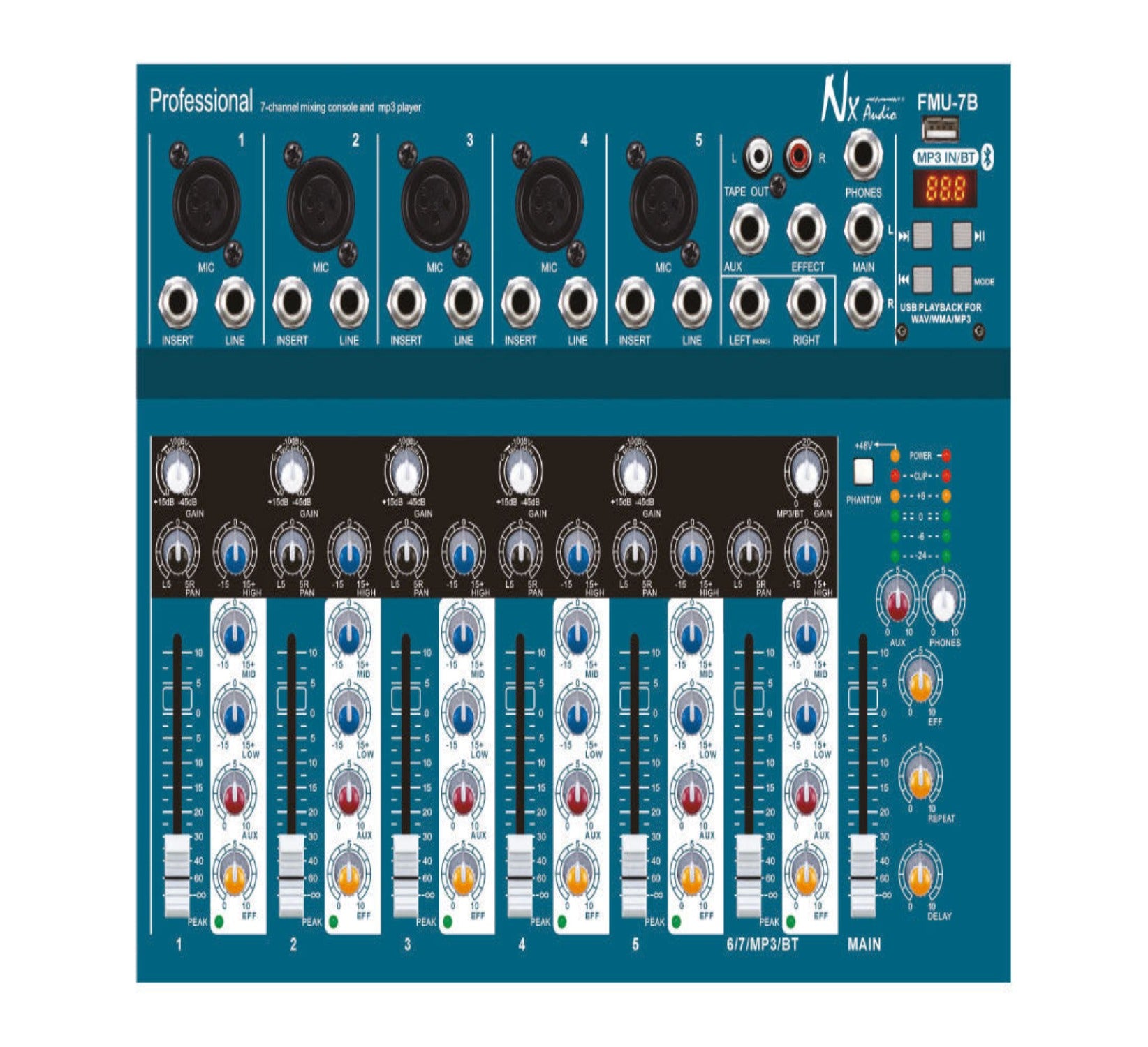 FMU7-B Live mixer is an 7 Channel Mixer with built in USB player, 5 xlr Bal Mic Line & 1 Stereo with Bluetooth