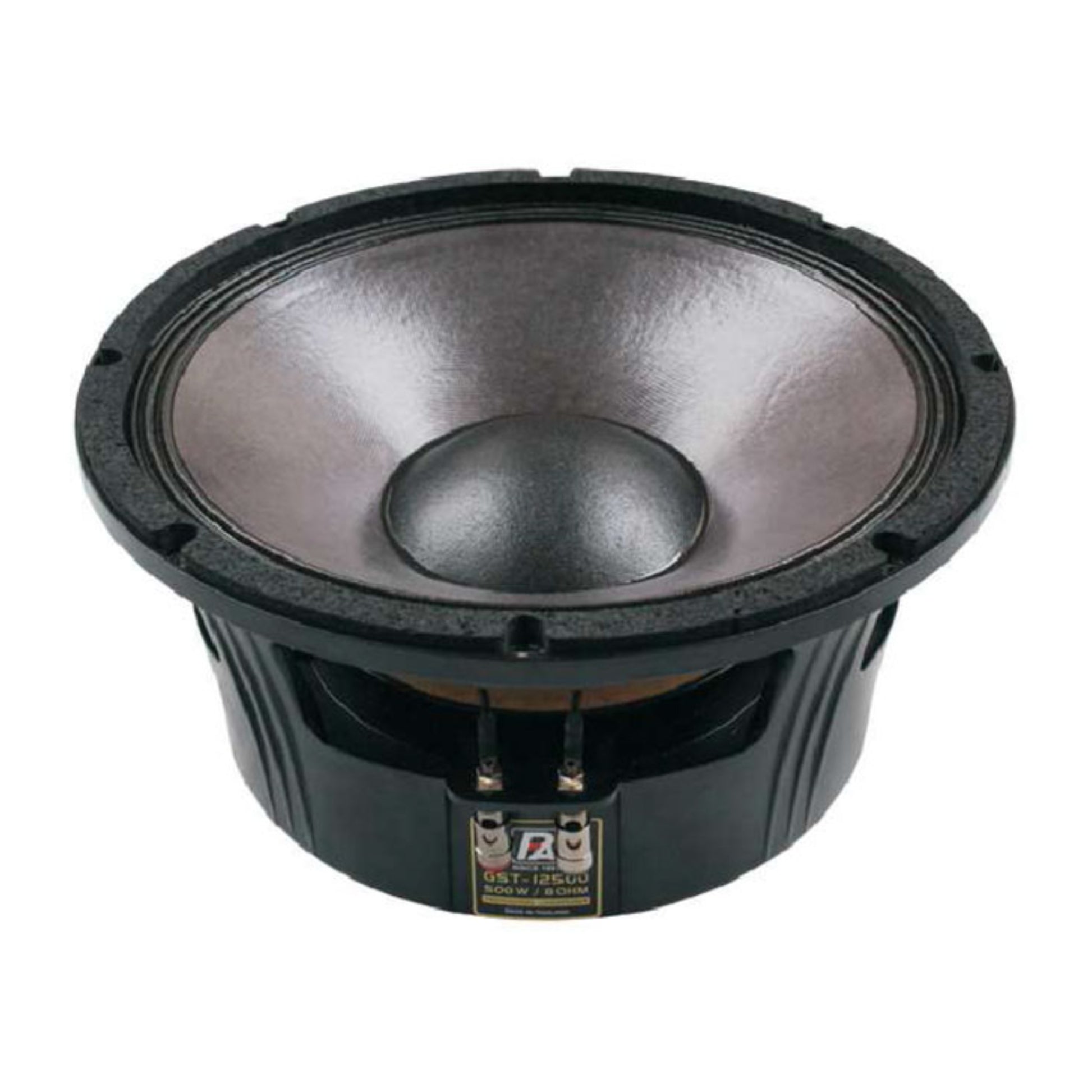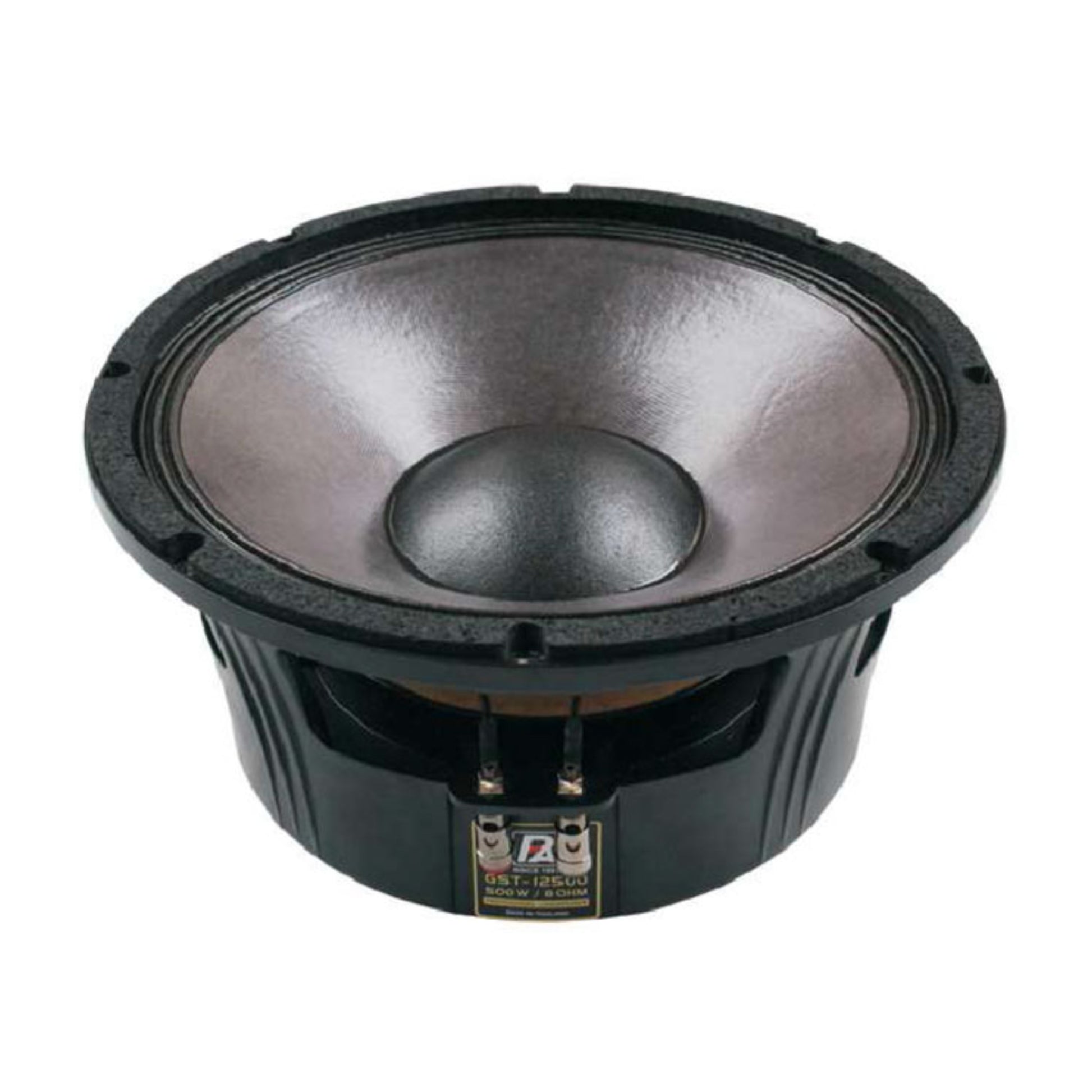 The P.Audio GST12-500 is a 12 inch (305mm) diameter high performance woofer. The design utilizes a medium format 3 inch 76mm) nominal voice coil diameter with a very light weight aluminum coil configured in an inside/outside wind geometry. This light weight design, coupled with a low moving mass cone offers excellent transient response. The large format ferrite based magnet structure produces very high conversion efficiency. Inside/outside winding geometry assists in coil cooling and improves both transducer power handling and system reliability. The GST12-500 also features a very long air gap height that improves transducer linearity.