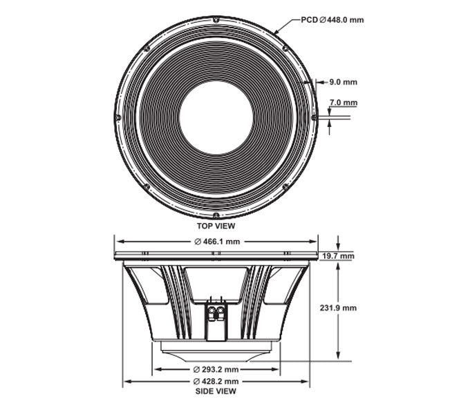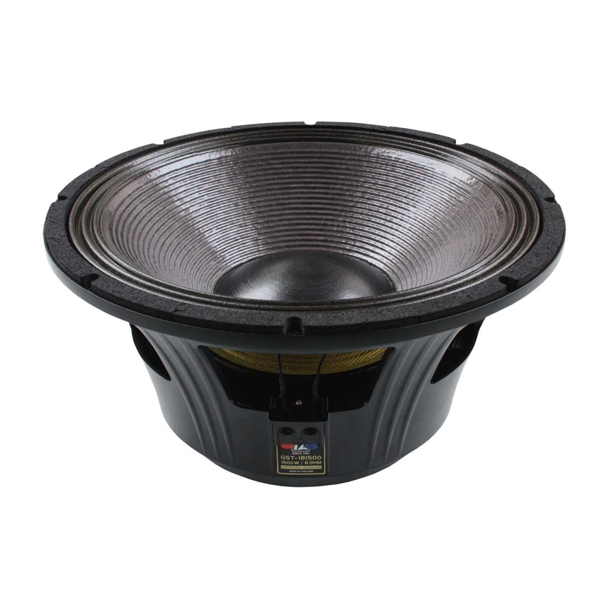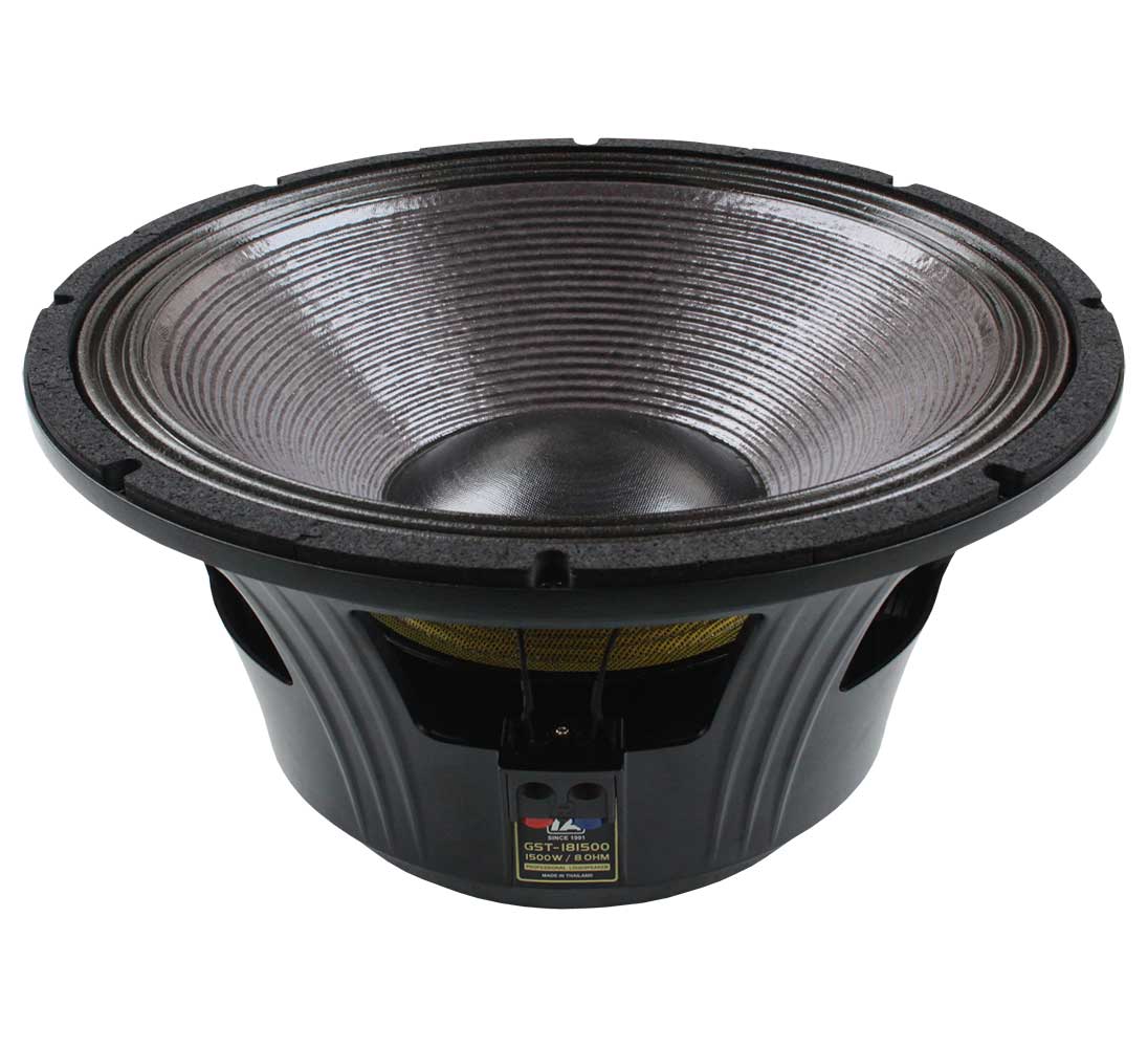 The P Audio GST18-1500 is an 18 inch (457mm) diameter high performance very low frequency sub woofer transducer. The design utilizes a very large format 5 inch (127mm) nominal voice coil diameter with a very high power copper based coil configured in an inside/outside wind geometry. The large radiating area and deep bass performance insure that the GST18-1500 is capable of very high impact low frequency response. The transducer also offers a double silicone spider design that improves long term mechanical reliability and mechanical linearity. The large format ferrite based magnet structure produces very high conversion efficiency. The ferrite design includes a double stack permanent magnet geometry that increases maximum physical excursion capability. Inside/outside winding geometry assists in coil cooling and improves both transducer power handling and system reliability. The GST18-1500 also features a very long air gap height that improves transducer linearity.