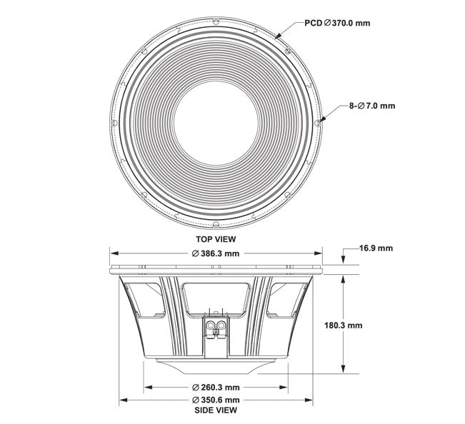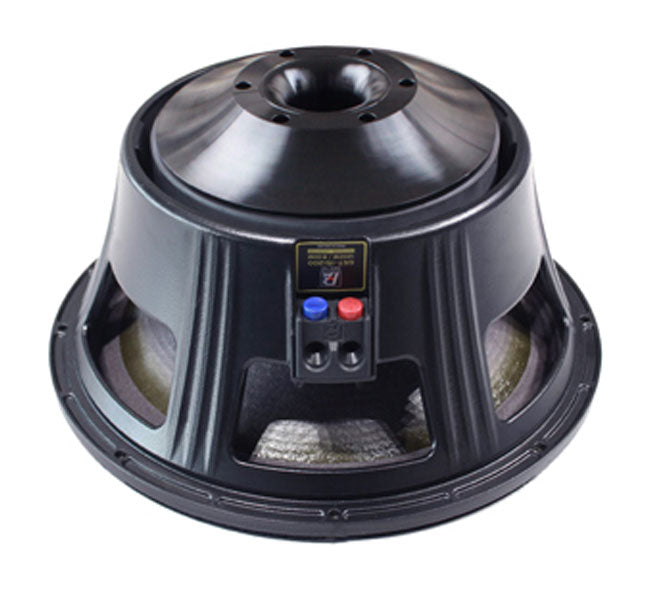 The P.Audio GST15-1200 is a 15 inch (381mm) diameter high performance low frequency woofer. The design utilizes a large format 4 inch (101.6mm) nominal voice coil diameter with a very high power copper based coil configured in an inside/outside wind geometry. The design provides a very high peak power handling rating of 4800 Watts. The large format ferrite based magnet structure produces very high conversion efficiency. Inside/outside winding geometry assists in coil cooling and improves both transducer power handling and system reliability. The GST15-1200 also features a very long air gap height that improves transducer linearity.