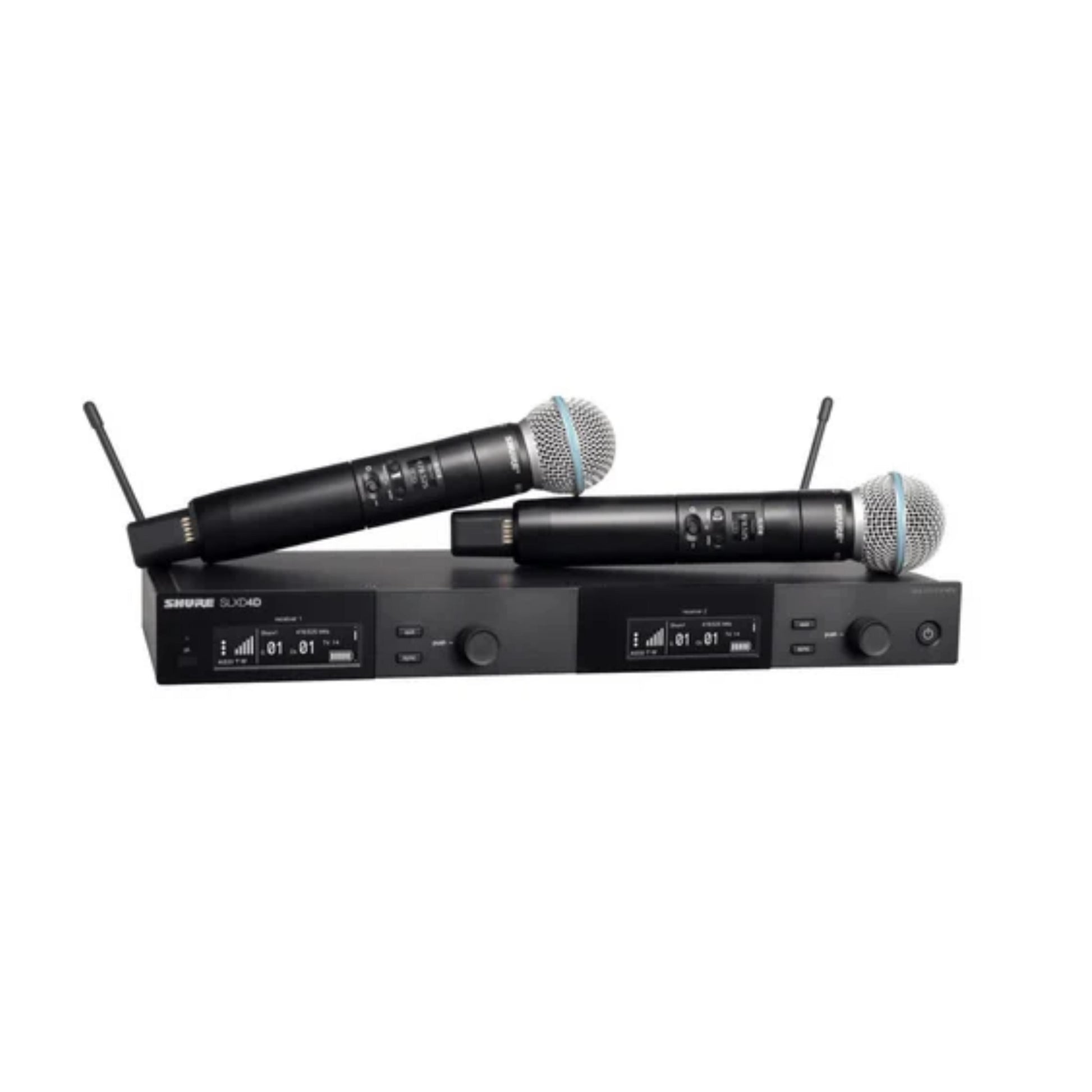 The Shure SLXD24D/SM58 Dual Hand Wireless Microphone System includes two Shure SM58 Handheld Transmitters and the SLXD4D 2-channel Digital Wireless Receiver. The SM58 is seen on stages around the world because of its legendary sound and its go-anywhere, do-anything construction. If you love the SM58 already and want a wireless version, this is the system to choose.Shure’s cutting edge digital wireless technology delivers 24-bit audio resolution with an almost imperceptible 3.2ms of latency. Add in the working range of 100 meters (328 feet), and you’ve got a recipe for serious wireless potential. If you’re ready to take the plunge and give your system a much-needed upgrade, you can’t go wrong with a Shure SLX-D wireless setup.