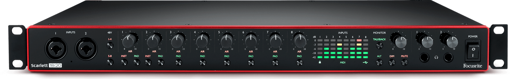 The heart of your setup. High channel count. Professional quality audio. Pro features, including talkback mic and speaker switching. 18i20 makes any space a studio.