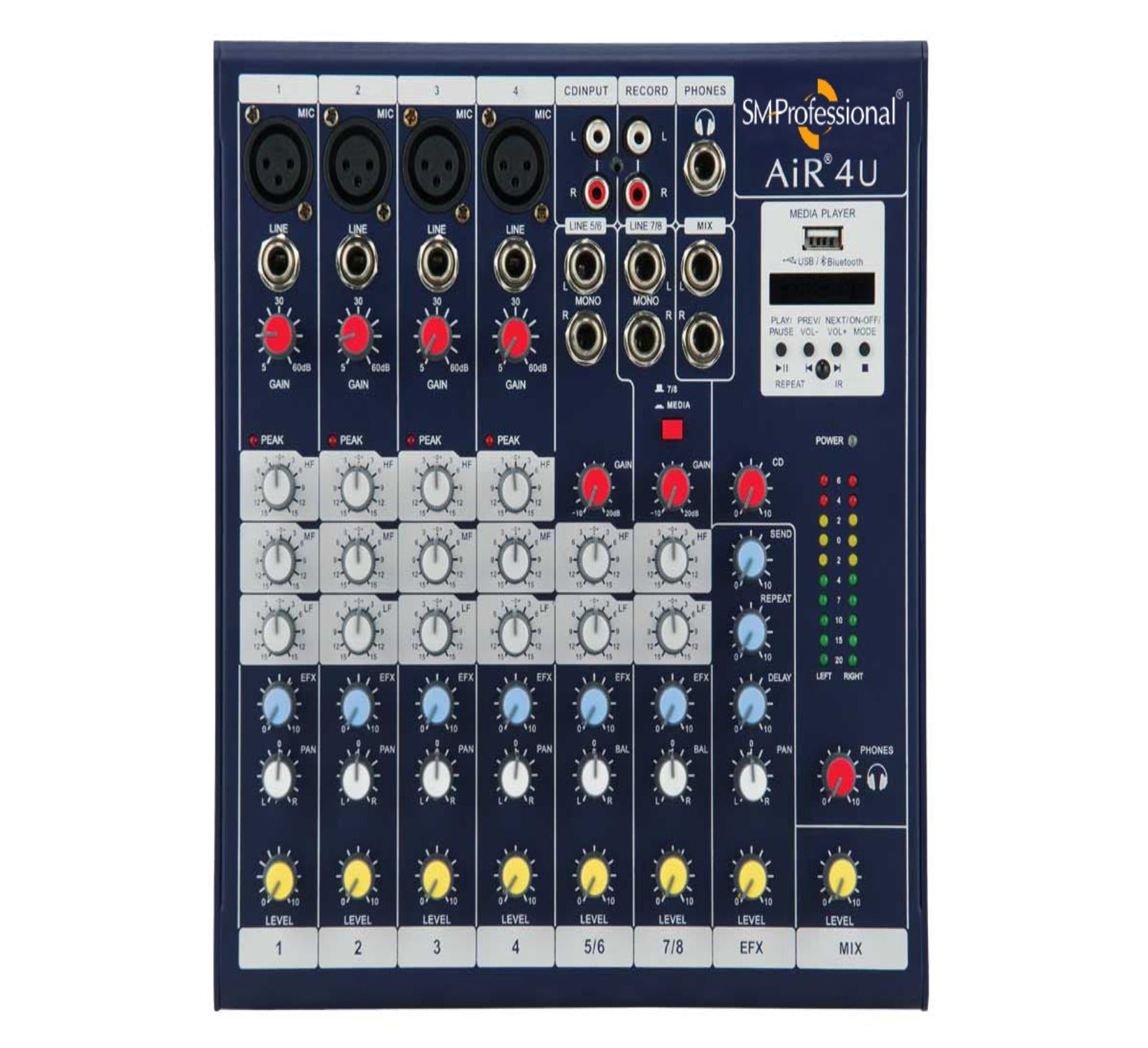 The AiR 4U is an ultra-compact mixing console for budget-conscious users who refuse to sacrifice sound quality, value, and reliability. The mixer features high-quality delay EFX onboard, USB MP3 media player with transport control and IR remote control, and built-in Bluetooth connectivity for wireless streaming.