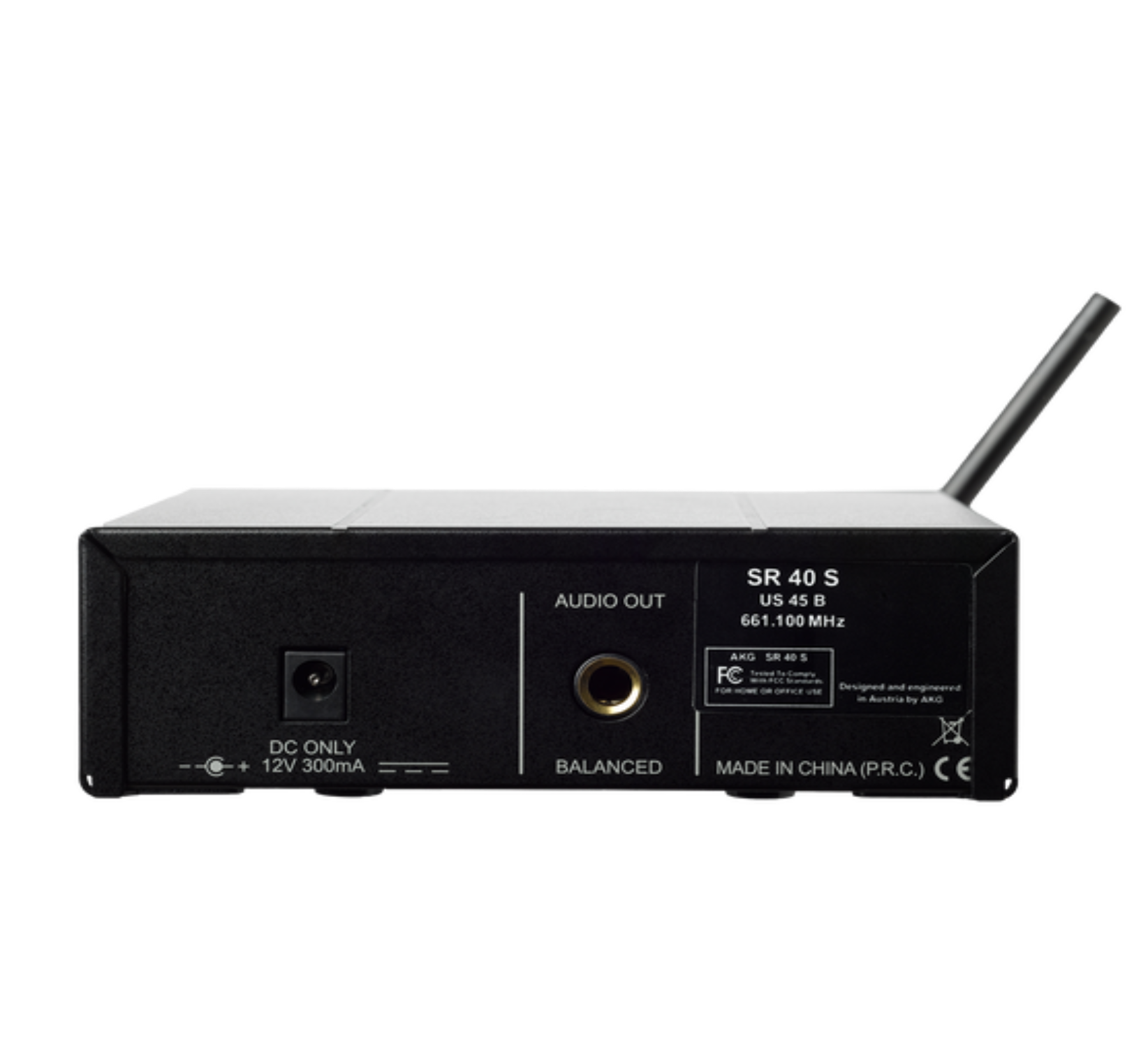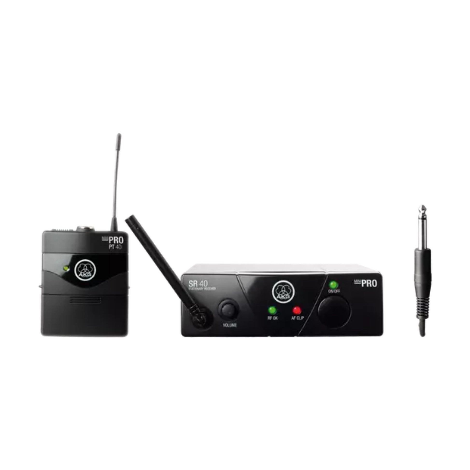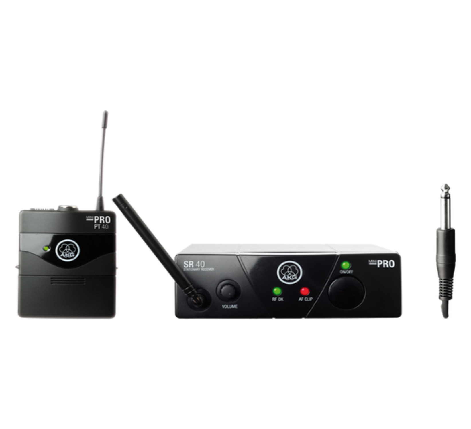 The WMS 40 Mini instrumental systems features AKG’s unique HDAP (High Definition Audio Performance) technology ensures the best possible, most realistic sound at any time. The system includes an SR 40 MINI receiver, a PT 40 MINI pocket transmitter, a MKG L instrument cable, a universal power supply with US/UK/EU adapter, and one AA size dry battery.The SR 40 Mini receiver provides three status LEDs indicating ON/OFF status, received signal strength (RF OK), and audio clipping (AF CLIP). The VOLUME control sets the level at the ¼" output jack. The supplied switched mode power supply operates on any AC voltage from 110 to 240 VAC and includes EU, UK, and US adapters.