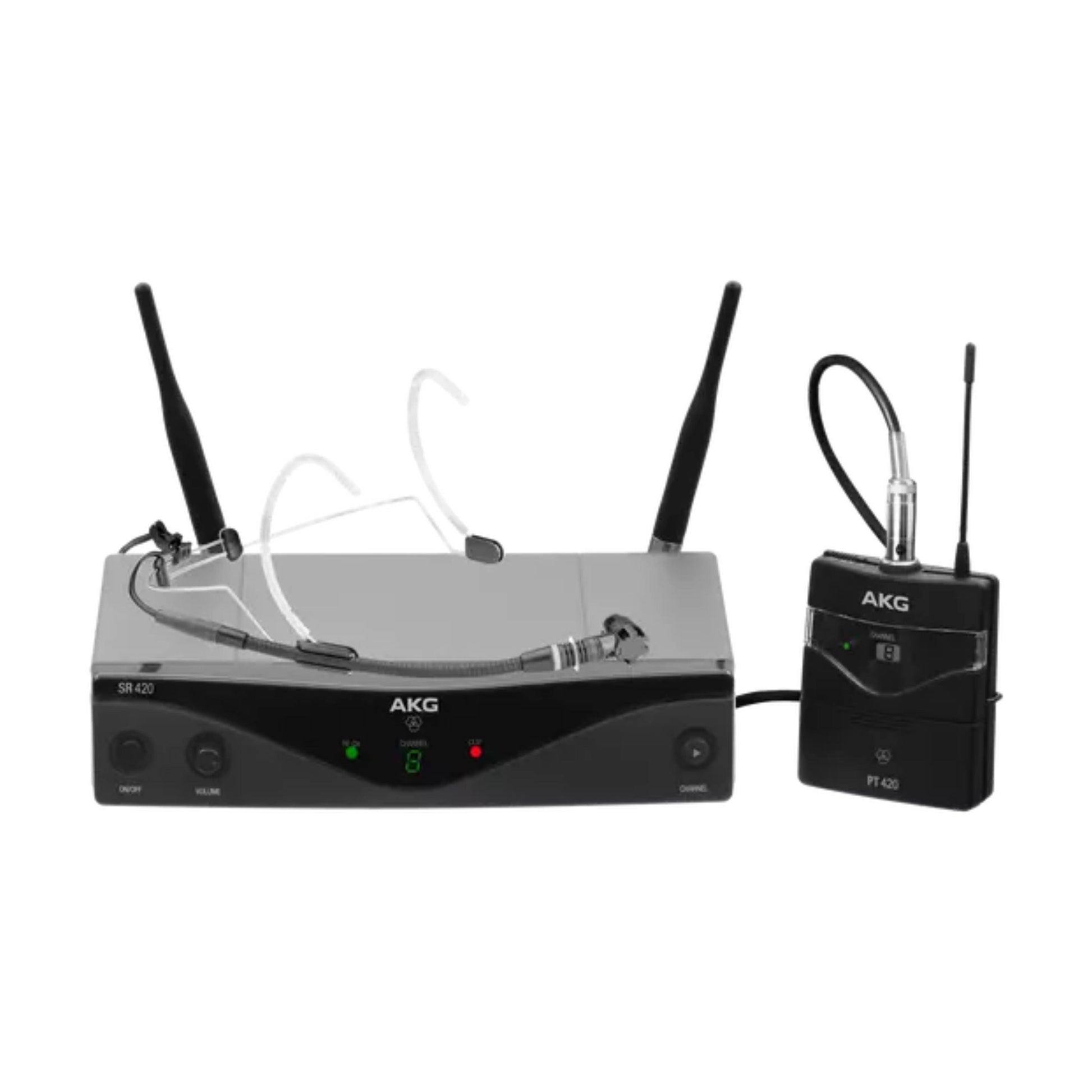 The AKG WMS420 UHF Wireless Headworn Microphone System is designed for live sound reinforcement applications such as for public address, presentations, installations, and performances that require up to eight simultaneously operating systems over a 30 MHz bandwidth. This system consists of a PT420 Beltpack Wireless Microphone Transmitter, an SR420 UHF Stationary Wireless Receiver, two detachable RF antennas, an AC adapter for the receiver, a AA-size battery for the transmitter, and a C555 L headworn microphone.