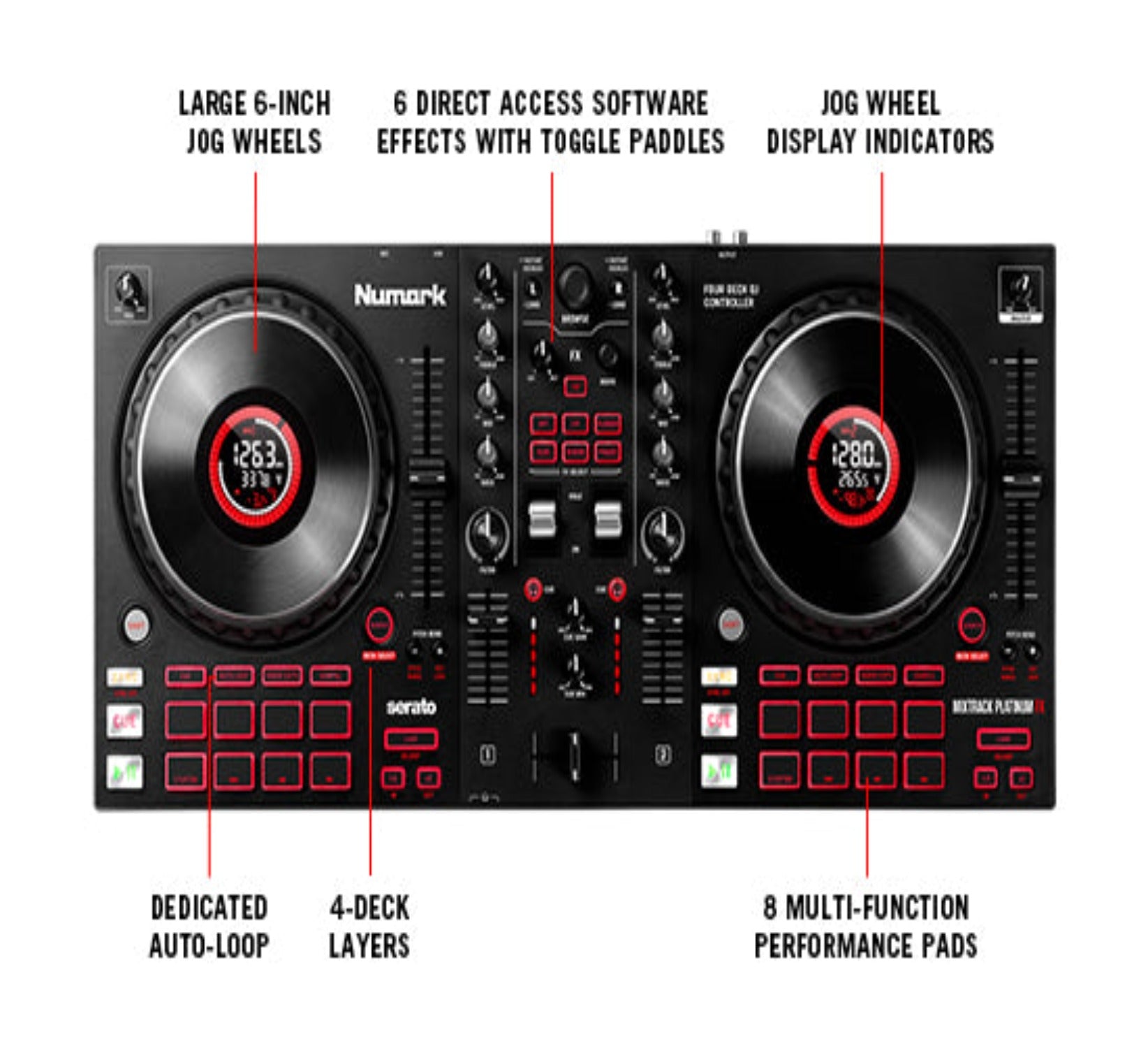 The Mixtrack Platinum FX has all the essentials you need to sound like a professional DJ! At its core, Mixtrack Platinum FX is a 24-bit 4-deck digital DJ controller with a dedicated software effects section, large 6-inch capacitive-touch jog wheels with built in hi-res displays and 16-multifunctional performance pads. Ready to take on any DJ style and perfect for small events, parties and developing your DJ skills, Mixtrack Platinum FX fuses in-demand functionality with all the tools to craft your signature style – your entry-point into a world of unrestricted DJ performance starts here!